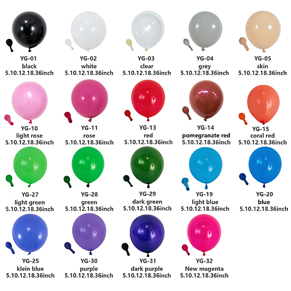Οι τύποι μπαλονιών που παράγονται περιλαμβάνουν διάφορα μεγέθη (5, 10, 12, 18, 36 ίντσες), σχήματα (στρογγυλά, καρδιά, ρόκα, επίπεδο στρογγυλό, κρύσταλλο), ειδικά εφέ (ματ, γυαλιστερό, περλέ, μεταλλικό, εμπριμέ, πούλιες/φτερά) μπαλόνια για να καλύψουν τις ανάγκες σας για ολόκληρα μπαλόνια 10 ιντσών.