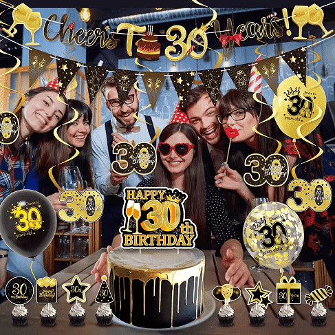 Η χάρτινη κάρτα γενεθλίων είναι ο πυρήνας της διακόσμησης της τούρτας: η κύρια κάρτα βασίζεται σε λέξεις όπως "Χρόνια Πολλά 30α Γενέθλια" και ταιριάζει με το σχήμα του φλυτζανιού σαμπάνιας. Το μέγεθος είναι μεγάλο και κατάλληλο για τη διακόσμηση της κύριας τούρτας. Υπάρχουν επίσης κυκλικό λογότυπο «30», αστέρια, κορώνες και άλλες μικρές κάρτες, κατάλληλες για cupcakes, από παχύρρευστο σκληρό χαρτόνι, με μπαστούνια μπαμπού στο κάτω μέρος, που μπορούν να μπουν για χρήση.
