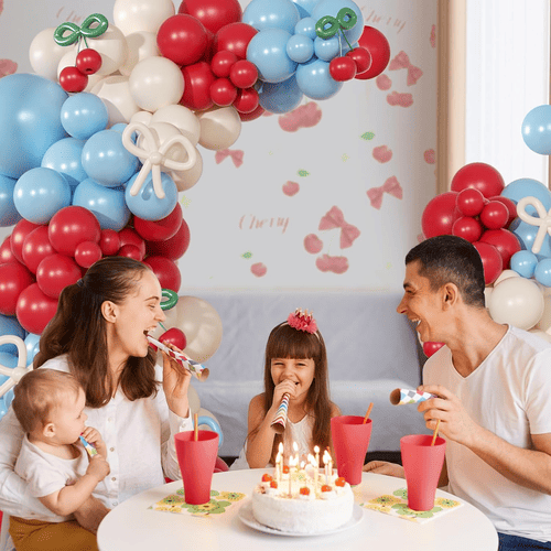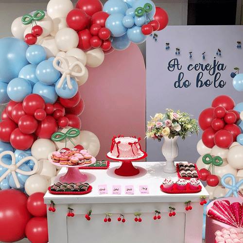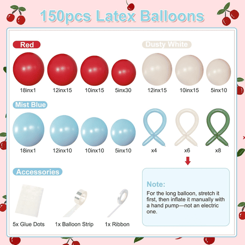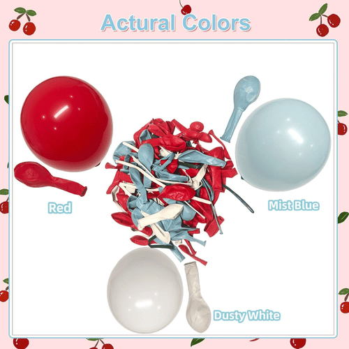 Η καμάρα με μπαλόνι Cherry Blossom συνοδεύεται από διάφορα μπαλόνια λατέξ, όπως στρογγυλό μπαλόνι από λάτεξ και μακρύ μπαλόνι από λάτεξ. Το συνολικό στυλ του κιτ είναι θετικό και χαριτωμένο, αγαπήθηκε από πελάτες σε όλο τον κόσμο. Τα χρώματα του στρογγυλού μπαλονιού λατέξ είναι κόκκινο, λευκό σκονισμένο και μπλε ομίχλη. Και για το μακρύ μπαλόνι λατέξ είναι μπλε ομίχλης, σκονισμένο λευκό και πράσινο, τα μακριά μπαλόνια λατέξ χρησιμοποιούνται για να φτιάξουν το στυλ παπιγιόν και το στυλ κερασι.