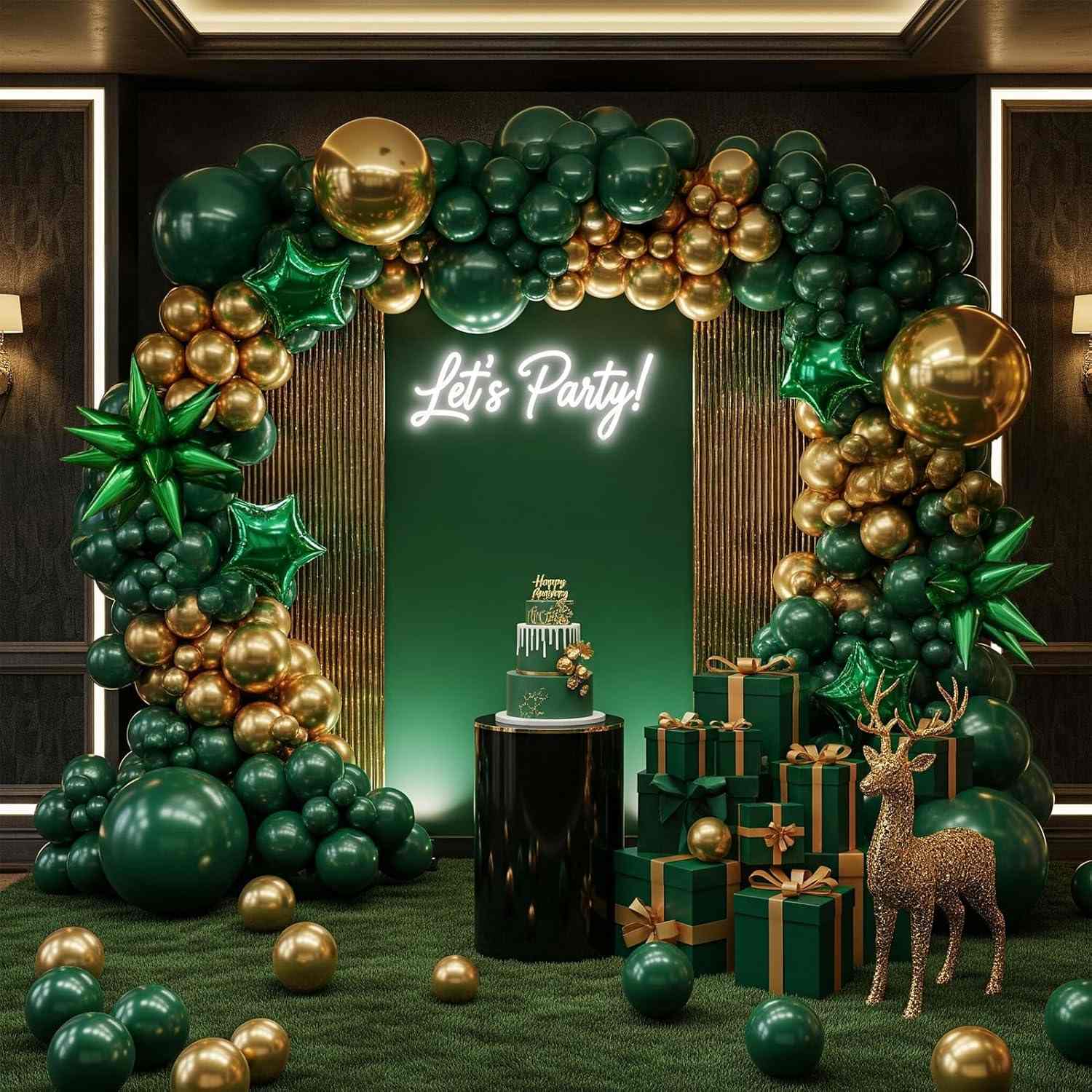 Η πράσινη και χρυσή καμάρα με μπαλόνι χρησιμοποιεί φυσικούς και πολυτελείς τόνους ως κύρια ιδέα. Ο συνδυασμός πράσινου και χρυσού κάνει μια φρέσκια και κομψή εμφάνιση για πάρτι. Το τόξο έχει πολλές πράσινες αποχρώσεις όπως ματ σκούρο πράσινο, ρετρό πράσινο φασολιών, ρετρό πράσινο αβοκάντο, ρετρό σκούρο πράσινο και ούτω καθεξής. Κάθε χρώμα δείχνει το δικό του στρώμα και υφή. Τα χρυσά μπαλόνια ταιριάζουν πολύ με τα πράσινα. Τα πράσινα φέρνουν μια ήρεμη και φυσική αίσθηση. Τα χρυσά προσθέτουν λάμψη και μια πινελιά πολυτέλειας. Τα δύο χρώματα αλληλοσυμπληρώνονται. Δημιουργούν μια ατμόσφαιρα που είναι εκλεπτυσμένη και κομψή.
