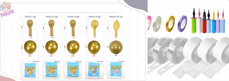 Η καμάρα έχει αλυσίδα μπαλονιών Niun®, κουκκίδες κόλλας και πετονιά. Οι χρήστες μπορούν να το κατασκευάσουν με οποιονδήποτε τρόπο ώστε να ταιριάζει στον χώρο. Μπορεί να κατασκευαστεί ως κιτ γιρλάντα ή διακόσμηση τοίχου. Μπορεί να κάνει όλο το σχήμα να έχει περισσότερες στρώσεις. Ο συνδυασμός μεγεθών μπαλονιού κάνει το σχήμα να φαίνεται πιο τρισδιάστατο και ζωντανό. Μπορούμε επίσης να δώσουμε επιπλέον εξαρτήματα μπαλονιών ή να ορίσουμε προσαρμοσμένες ποσότητες. Μπορεί να καλύψει διαφορετικές ανάγκες για διαφορετικές σκηνές διακόσμησης.