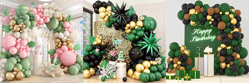 Μπορείτε να χρησιμοποιήσετε μπαλόνια λευκού ή αχλαδιού χρώματος με πράσινη και χρυσή καμάρα μπαλόνι. Θα γίνει απαλό και ζεστό και θα μοιάζει με τη φρεσκάδα ενός ανοιξιάτικου κήπου. Όταν συνδυάζεται με μπαλόνια σε ροζ χρώμα, μπορεί να δημιουργήσει μια ζωντανή αίσθηση που είναι γλυκιά χωρίς να κουράζει, εμπνέοντας μια ρομαντική ατμόσφαιρα σε baby shower και πάρτι με θέμα τα κορίτσια. Ακόμη και όταν συνδυάζονται με βαθύτερα χρώματα όπως το μαύρο και το καφέ, τα πράσινα και τα χρυσά χρώματα μπορούν να εξισορροπήσουν το βάθος και τη σταθερότητα αυτών των αποχρώσεων με την εντυπωσιακή χρωματική τους ένταση, δημιουργώντας μια μοντέρνα αλλά ζεστή εορταστική ατμόσφαιρα.