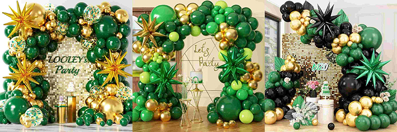 Όταν το πράσινο ματ, το σκούρο πράσινο και άλλα πράσινα μπαλόνια αναμειγνύονται με χρυσό, οι διαφορετικές αποχρώσεις του πράσινου αισθάνονται σαν τη ζωή ενός δάσους και την ντεμοντέ κομψότητα που αποτυπώνεται στην αψίδα. Ο χρυσός λάμπει σαν το φως του ήλιου, κάνοντας όλο το χρώμα πιο φωτεινό. Το πράσινο που αλλάζει διατηρεί την καμάρα ζωντανή και ο μεταλλικός χρυσός απαλύνει τη βαρύτητα του πράσινου. Το αποτέλεσμα είναι φυσικό, πλούσιο και φανταχτερό, ταιριάζει σε πολλές σκηνές ρετρό πάρτι.