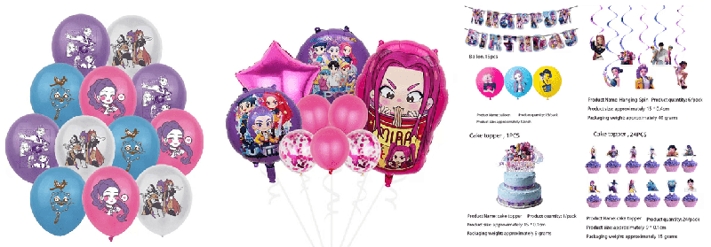 Περιλαμβάνει κυρίως θέμα Demon Huntersεμπριμέ λάτεξ μπαλόνια, μπαλόνια από αλουμινόχαρτο κ.λπ., τα οποία ταιριάζουν με μπαλόνια και αξεσουάρ μπαλονιών του ίδιου συστήματος χρωμάτων, συμπεριλαμβανομένων χάρτινων σημαιών γενεθλίων, πρόσθετων για τούρτες και άλλων προϊόντων τυπωμένων με κλασικές εικόνες του Demon Hunters. Τα προϊόντα έχουν υψηλό κορεσμό χρώματος και δεν ξεθωριάζουν εύκολα. Χρησιμοποιούνται ασφαλή και φιλικά προς το περιβάλλον υλικά και οι άκρες είναι στρογγυλεμένες για να αποτρέψουν τα παιδιά από το να γρατσουνιστούν κατά λάθος ενώ παίζουν και λαμβάνονται υπόψη οι απαιτήσεις ασφαλείας στα οικογενειακά πάρτι. Το προϊόν είναι κατάλληλο για μια ποικιλία σκηνών, είτε πρόκειται για παιδικό πάρτι γενεθλίων είτε για πάρτι θαυμαστών, μπορεί να καλύψει τις ανάγκες καθηλωτικής διάταξης.