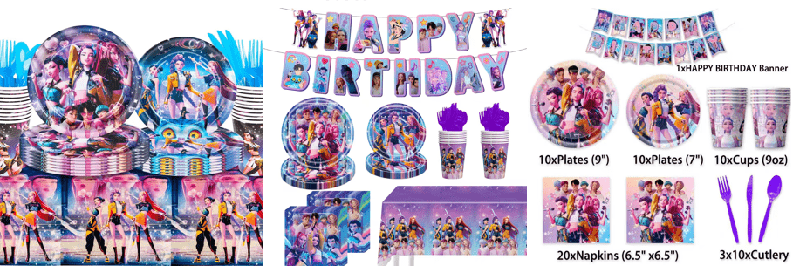 Το θεματικό επιτραπέζιο πάρτι περιλαμβάνει χάρτινα πιάτα, χάρτινα ποτήρια, χαρτοπετσέτες, μαχαίρια και πιρούνια και κάρτες διακόσμησης τούρτας. Κάθε επιτραπέζιο σκεύος είναι τυπωμένο με στοιχεία Demon Hunters και γράφεται με τις λέξεις Happy Birthday και Party Time, δημιουργώντας μια χαρούμενη ατμόσφαιρα πάρτι. Τα σερβίτσια για πάρτι είναι καλής ποιότητας και πληρούν τις προδιαγραφές ασφάλειας τροφίμων. Οι χάρτινοι δίσκοι και τα κύπελλα είναι κατασκευασμένοι από χοντρό χαρτί για τρόφιμα χωρίς οσμή και επιβλαβή πρόσθετα. Το μελάνι εκτύπωσης είναι φιλικό προς το περιβάλλον και ασφαλές, μη τοξικό και αβλαβές και μπορεί να έρθει σε άμεση επαφή με τρόφιμα.